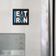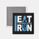 Grunge-Stil Typografie-Design-Emblem mit dem Wort "I Eat darum I Run" in fett san serf Buchstaben mit Silhouette aus dem Buchstaben "A" in Eat (Gabel und Messer) und aus dem Buchstaben "U" in RUN (Silhouette von Laufbeinen/Füßen).