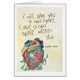 Kleiner lila Vogel, der oben rechts auf einem menschlichen Herz sitzt und unter ihm grüne Weinreben wachsen. Geschehen in Aquarellen.