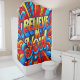Dieser bunte Duschvorhang sagt: "Ich glaube an dich!" darauf.