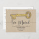 Lass deinen Freunden und der Familie deine neue Adresse mit dieser rustikalen Schlüsselankündigung Postcard. Diese Vorlage enthält einen Vintagen Stilschlüssel in Imitaten Gold auf einem texturierten Kraft Hintergrund. Vollständig anpassbarer Text, sehr einfach zu bearbeiten mit Ihren persönlichen Daten.