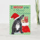 Adorable Bulldog Welpe mit einer Weihnachtsmannmütze voller Weihnachtsgeschenke auf einem grünen Polka Dot-Hintergrund. Weihnachts Grußkarten anpassen.