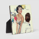 Künstler:Joe DeMers | Frau in einem Zebrakleid und Button in roter Blume, die sich in einem Stuhl hinüber lehnt und mit einem Mann in einem weißen Anzug spricht