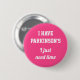 Dieser Knopf wurde für eine Person entwickelt, die Parkinson's Disease zu tragen hat. Es lautet: Ich habe Parkinson. Ich brauche nur Zeit. Die Wörter sind in weißen Buchstaben auf einem hellrosa Hintergrund gehalten, sodass sie leicht lesbar sind. Der Zweck der Schaltfläche ist, dass es manchmal hilft, anderen lassen, dass es einen Grund gibt, warum man zittert und nichts schnell tun kann.