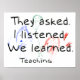 Danke an einen Lehrer, gib ein Geschenkposter. Das Plakat der Weisheit lehrt heißt: "Sie fragte. Ich hörte zu. Wir haben gelernt."