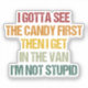 Ich werde die Bonbons zuerst sehen, dann bekomme ich in den Van Ich bin nicht dumm - ich muss die Süßigkeiten zuerst sehen, dann komme ich in den Bus, ! Wenn Sie Liebe mit Sarkasmus oder kennen jemanden, der immer sarkastisch ist.
