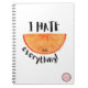 Dieses sarkastische Notizbuch hat einen kawaii-orangefarbenen Obstschnitt mit dem Text "I Hate Everything". Dieses niedlich orangefarbene Design ist handbemalt mit Aquarellen. Der Text kann nicht angepasst werden, aber Sie können die Hintergrundfarbe für alles ändern, was Sie wollen. Ein perfektes Notizbuch und / oder ein Geschenk für jeden sarkastischen Bürovorrat Junkie, die Lieben, Notizen mit niedlichen und farbenfrohen Schreibwaren zu machen.