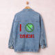 Ich hasse Tomaten, die Denim-Jacke von Frauen. Humorvolles Design verwendet rote Buchstaben, ein grünes Herz und das internationale "NO" Zeichen, um zu lesen: "Ich hasse Tomaten". Für diejenigen, die nicht "Herz" Liebe Äpfel.