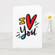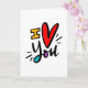 ©2019, handgezeichnetes Design von Dio Perez. Die Karte ist hell und auffällig. Es sagt nicht nur, dass ich dich Liebe, sondern sagt es mit viel Farbe und Enthusiasmus.
