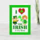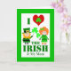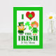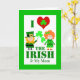 Ich Herz / Liebe die Irish & My Mama, St. Patrick's Day Papier Grußkarte. St. Patrick's Day Card für eine Mutter / Mutter. Süße Figuren mit Kleeblättern sind als Kobold und ein irisches Mädchen mit orangefarbenem Haar und polika-gepunktetem Kleid gekleidet. Ein rotes Herz mit einem Kleeblatt drin ist oben auf der Karte. Verschiedene Grüntöne sorgen für ein irisches fröhliches Aussehen. Charaktere höflich:Clker. Art, Bild und Vers Copyright © Shoaff Ballanger Studios.