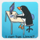 Ein Pinguin, der einen Computer bedient, direkt nach dem Mittagessen mit dem Text "I can has Linux?". Der Text ist anpassbar, sodass Sie Ihren eigenen hinzufügen können. Ideal für jeden Linux-Liebhaber.