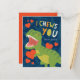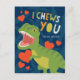 Niedliche Valentinstag-Karte für Kinder mit einer Abbildung eines grünen T-Rex mit einem roten Herz auf blauem Hintergrund mit den Worten "Ich wähle dich aus". Design von Shelby Allison.