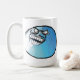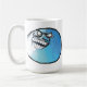 Ich lag Raserei-Comic-Gesicht meme. Blaues Schwarzweiss. Öffnen Sie Mund, Schnurrbart und lachen, weiße Zähne.