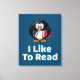 Niedlicher und lustiger Pinguin "I Like To Read", der seine Bücher hält.