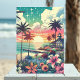Jubiläumskarte zum Thema Strand. Hübsch türkisfarbener, aquamariner und rosa Meerblick mit Sonnenuntergang und Silhouetten von Palmen, wunderschönen tropischen Blume und einem Pier und Strandhaus.
