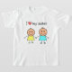 Niedliche Strichmännchen, eines mit einem gelben Kleid und das andere mit einem blauen Kleid, die Hände mit einem großen, fröhlichen Lächeln halten. Über den Mädchen in schwarzer Schrift sind die Worte, die ich meine Schwester Liebe. Das Wort Liebe wurde durch ein hübsches rotes Liebe-Herz mit einem kühnen Rand ersetzt.