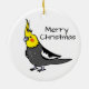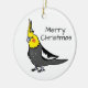 Eine süße Cartoon-Zeichnung eines normalen grauen Nymphensittichs mit gelbem Gesicht. Es wird hier auf einem maßgeschneiderten Weihnachtsschmuck gezeigt. Sie können den Haustiervogel bewegen und den Text "Frohe Weihnachten" in jeden beliebigen Text ändern. Wählen Sie aus verschiedenen Schmuckformen und -größen. Fügen Sie einen farbigen Hintergrund hinzu, wenn Sie möchten. Dieser Schmuck ist ein lustiges kleines Geschenk für jeden Nymphensittich-Liebhaber!