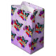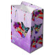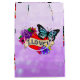 Hübsch romantische Geschenktasche für einen Valentinstag, Geburtstag oder Geburtstag. Tattoo Stil Graffiti Text und Herz in violetten Blumen und ein blauer Schmetterling verpackt.