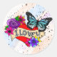 Ich Liebe Sie | Herz, Rose und Schmetterlinge Runder Aufkleber