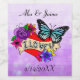Personalisierte Hübsch romantische Weinetiketten für einen Valentinstag, Hochzeit, Geburtstag oder Geburtstag. Tattoo Stil Graffiti Text und Herz in violetten Blumen und ein blauer Schmetterling verpackt.