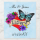 Personalisierte Hübsch romantische Weinetiketten für einen Valentinstag, Hochzeit, Geburtstag oder Geburtstag. Tattoo Stil Graffiti Text und Herz in violetten Blumen und ein blauer Schmetterling verpackt.