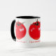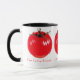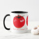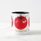 Diese Tasse zeichnet sich durch ein originelles Design aus, mit drei roten Tomaten in einer Reihe am oberen Ende, und dem Satz "Ich Liebe Tomatensuppe!" unter den Fotos, in drei Sprachen: Französisch, Englisch und Spanisch. Die Tomate im Foto sieht "elektrifiziert" aus, mit dem grünen Stamm und Blätter aus Zickzacklinien, und einem Zickzack-Linien-Weiß-Highlight auf der glänzenden Tomatenhaut. Diese Tomaten sind rot heiß, und diese Tasse ist großartig für Tomatensuppe.