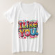Das Design des T - Shirt "I Like You" zeichnet sich durch spielerische, handgezeichnet Typografie mit einem lustigen, freundlichen Ambiente aus. Der Text ist in einem lässigen, fließenden Stil angeordnet, der mit kräftigen, lebendigen Farben gestaltet ist, die das Auge erfassen. Um die Worte herum können fröhliche Doodles wie Herz, Sterne oder Smiley zerstreut werden, was dem Design eine positive, positive Energie verleiht. Das Gesamtbild ist lichtdurchflutet und einladend und eignet sich hervorragend, um Zuneigung niedlich und stilvoll auszudrücken.