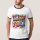 Das Design des T - Shirt "I Like You" zeichnet sich durch einen spielerischen, handgezeichnet Satz in fett gedruckten, sonderbaren Buchstaben aus. Der Text ist der Brennpunkt, geschrieben in einem lässigen, freundlichen Schriftart mit lebhaften Farben, sodass er ein angenehmes und ansprechbares Ambiente schafft. Um die Worte herum gibt es kleine Doodles wie Herzen, Sterne oder Smiley, um die positive und leichte Botschaft zu verbessern. Das Design fühlt sich frisch und jugendlich an, perfekt für die Verbreitung von Positivität und guten Vibes.
