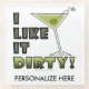 Ein Martini-Artcocktailglas, das mit einem schmutzigen Martini gefüllt wird und mit einem Klassiker, Piment angefüllte Cocktailolive geschmückt ist, begleitet das lustige Sprichwort, ich mögen es schmutzig! Herein getan, was sonst, Olivgrünfarben mit den schwarzen und roten Akzenten.