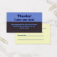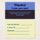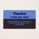 "Danke! Ich schulde dir eins!" Das ist, was diese Karte auf der Vorderseite sagt, zusammen mit "Diese Karte ist gut für eine Rückkehr zu Gunsten. Erlöse es, indem du es mir zurückgibst. Nochmals vielen Dank!" Auf der Rückseite können Sie detailliertere Informationen über den Gefallen schreiben. Du weißt, wie das geht; jemand tut einen großen Gefallen für dich und du sagst "Danke, ich schulde dir einen", aber...sie glauben es nicht wirklich. Mit dieser Karte können Sie zeigen, dass Sie wirklich sehr schätzen, was sie für Sie getan haben, und zeigen, dass Sie wirklich beabsichtigen, ihnen zu helfen, wenn sie es brauchen. Natürlich ist dieser Bereich auf der Rückseite, wo "Kommentare" steht, ein guter Ort, um zu schreiben, was Sie nicht für sie tun werden ...wie ihr Haus malen oder die Wahrheit biegen, um sie aus einem engen Winkel zu holen; eure Grenzen sind dir überlassen. Das ist "irgendwie" nur zum Spaß, aber dann, wie ich schon sagte, will man manchmal den Menschen, den Einfluss einer tiefen Dankesabstimmung wahrhaftig zu spüren, und das wird es auf eine leichtgeartete Weise tun, ohne einen von Ihnen unangenehm zu machen.