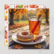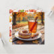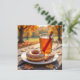 Eine hübsche Herbstkarte, um jemandem Herbstgrüße zu senden. Eine hübsche Illustration eines Tellers mit einem glasierten Donut, Apfelwein mit Zimtstangen und einem hübschen Herbstlaub-Hintergrund.