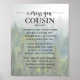 "Ich vermisse dich" Gedicht: "Ich habe heute mit Liebe an dich gedacht, aber das ist nichts Neues. Ich habe gestern und auch Tage davor an dich gedacht. Ich denke schweigend an dich. Ich spreche oft deinen Namen. Alles, was ich habe, sind Erinnerungen und Ihr Bild in einem Rahmen. Dein Gedächtnis ist mein Sake, mit dem ich nie etwas machen werde. Gott hat dich in seinem behalt, ich habe dich in meinem Herzen." Ideal, um sich an einen geliebten Cousin zu erinnern.