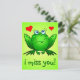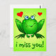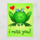 Ein niedlicher, grüner Cartoon Frosch mit roten Herzen, große googly blaue Augen, für Freunde und Liebste - "Ich vermisse dich!". Sie können den Text in eine beliebige Kurznachricht ändern, z.B. - Danke, in der Liebe, rufen Sie mich an, seien Sie hoppy!