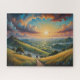 Eine Figur steht auf einem Pfad in den Hügeln, wenn die Sonne über ein friedliches Tal auf diesem schönen Puzzle aus Puzzle dell'Jigsaw Set. Friedlich und kontemplativ, mit viel Detail und Farbe.
