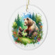 Personalisierte Weihnachtsschmuck. Ein Mammutbär spielt draußen mit ihrem Baby-Cubbär auf einem Feld aus Gras und Blume mit Kiefernhintergrund. Wasserfarben Stil ai art.