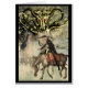 Ichabod-Kranich, der Gunpulver reitet, den Hauptanbaum überquert, während das Sleepy Hollow Headless Horseman im Schatten ein Schwertlurken hält.