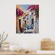 The painting features bright white buildings with blue accents, such as doors and windows, which are characteristic of the region. Vibrant pink bougainvillea flowers cascade over the walls and hang from balconies, adding a splash of color to the scene. A set of blue stone steps leads up to one of the buildings, and potted plants with pink flowers are placed along the pathway, enhancing the charming and serene atmosphere. The warm sunlight and clear blue sky create a bright and inviting ambiance, capturing the essence of a peaceful coastal town.