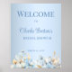 Ice blue gradient background with updated traditional typography spells out a joyful welcome to your wedding event. Bordered with watercolored ice blue and ivory peony blossoms.
