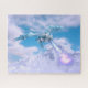 Ein blauer Eisdrache stürzt über einen bewölkten Himmel und atmet Eisheiß in Richtung schneebedeckter Berge.