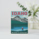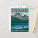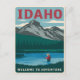 Ein Vintages Reiseplakat, das eine Person darstellt, die in einem ruhigen See, umgeben von Bergen und Bäumen in Idaho, angeln möchte. Das Plakat heißt Willkommen bei Adventure.