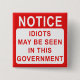 Dieses lustige Protest-Abzeichen ist genau das, was die Leute zum Lachen bringen soll. Dieses Abzeichen ist in Form eines Hinweises auf andere Produkte erhältlich und steht wie folgt: NOTICE, IDIOTS KÖNNEN IN DIESER REGIERUNG GESEHEN WERDEN. Gut, um an den Premierminister und andere Politiker zu schicken. Ich bin sicher, sie würden kichern! lol.