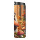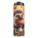 Diese charmante Abbildung zeigt einen niedlichen Igel mit großen blauen Augen, der sanft einen großen gepunktet-Rot-Weiß-Pilz mit seinen winzigen Pfoten hält. Die Szene ist Set in einem Herbstwald mit hohen Bäumen, abfallenden orangen Blätter, Farnen und anderen bunten Pilzen verstreut auf dem Waldboden, wodurch eine skurrile und bezaubernde Herbstatmosphäre entsteht.