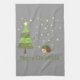 Niedlicher Igel mit Elfenhut und Weihnachtsbaum in einer sternenvollen Nacht. Frohe Weihnachten