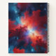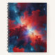 Una galaxia arremolinada de tonos rojos y azules que arden en el espacio, rodeada de estrellas brillantes.