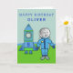 Ihr Foto Niedlich Astronaut Boy Rocket Geburtstagskarte. Niedliche individuelle Geburtstagskarte mit Astronautenjunge und seiner Rakete. Fügen Sie Ihr Bild in die Vorlage und personalisieren Sie die Karte mit dem Namen und Alter Ihres Kindes auf der Rakete. Ideal für einen Jungen, der Astronauten und Raketen Liebe.
