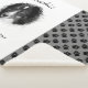 Benutzerdefinierte Vorlage für das Heimtierfoto in Schwarz-Weiß-Farben. Ersetzen Sie das Beispielbild durch ein Foto Ihres eigenen Tieres und personalisieren Sie die Textbereiche mit Ihrem eigenen Text. Ein Teil des Designs zeigt ein Muster von schwarzen Hundepads auf grauem Hintergrund. Das benutzerdefinierte Foto wird durch eine runde Form angezeigt, die jedem Bild einen ungleichmäßigen, weichen Rand verleiht.