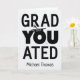 Einzigartige Abschluss-Karte mit dem Wort "YOU" anstelle des Buchstabens "U" in Graduated. Fügen Sie das Jahr zu der Graduierungsmütze, die auf dem Brief sitzt, "O". Fügen Sie am unteren Rand der Notebook-Papier-Aussehkarte einen beliebigen Namen hinzu. ©Christie Black