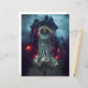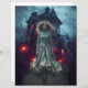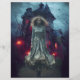 Eine geheimnisvolle junge Frau in einem fließenden Kleid steht vor einem gotischen Herrenhaus mit leuchtenden roten Fenstern, Set gegen einen dunklen und unheimlichen Himmel. Seltene Bäume und fliegende Fledermäuse verstärken die atmosphärische Spannung weiter. Digitale Kunstfotografie CS5