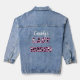 Erstellen Sie personalisierte Denim Jacken für Junggeselinnen-Abschied, wenn Sie den Namen der Braut zu dieser Jacke hinzufügen. Der Name der Braut erscheint in weißen Schriftzeichen über Kuh verstecken gemusterte Buchstaben, die "LAST RODEO" ausdrücken, was dies perfekt für Ihre Disco Cowgirl themed Junggeselinnen-Abschied.