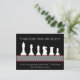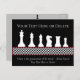 Zeigen Sie Ihre Liebe des Schachspiels mit dieser eleganten, anpassbaren Postkarte. Dieses Design zeigt ein Set von weißen Schachstücken, darunter der King, Queen, Bischof, Knight, Rook und Pawn auf einem schwarzen Hintergrund. Am unteren Rand befindet sich ein Schwarz-Weiß-Schachbrettmuster mit einem benutzerdefinierten Farbrahmen (Standardfarbe Rot). Die Farbe der Rückseite der Karte ist standardmäßig hellgrau und hat oben ein kleines schwarzes Queen-Schachstück. Drücken Sie einfach die Schaltfläche Anpassen, um die Hintergrundfarbe des Schachbretts, die Farbe des unteren Randes oder die Farbe der Rückseite zu ändern, wenn Sie möchten. Oben und unten befinden sich Punkte, um die Karte mit Ihrem eigenen Angebot oder Text im Standard-Weißdruck zu personalisieren. Das Standard-Zitat lautet: "Schach ist das Gymnasium des Geistes." von Blaise Pascal. Drücken Sie einfach die Schaltfläche Anpassen, um den Text zu bearbeiten oder zu löschen, oder die Schaltfläche Anpassen, um den Schriftart, die Textgröße oder die Textfarbe zu ändern. Ein großartiges Geschenk für Liebhaber von Strategiespielen, Schach, Schachbretts, Gaming-Turnieren, geometrischen Designs, Brettspielen und Schachfiguren. Dieses Design ist auf anderen Artikeln erhältlich und kann auf jeden Artikel im Zazzle-Marktplatz übertragen werden.