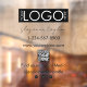 Ein schwarzes Firmenlogo-Branding-Fenster mit Dekor und Fensterheber mit Ihrem Firmenlogo, Slogan oder Tagline, Telefonnummer, Website, individuellem QR-Code und individuellen Social Media-Icons . Ein personalisiertes Schaufenster, ideal für Schaufenster und Schaufenster. Ideal für einen Geschäftshändler, der sein Firmenlogo und seine Markendarstellung gerne dekorieren möchte.